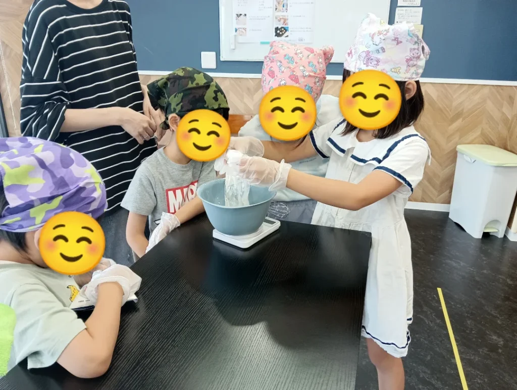 今週は調理のプログラムがあり、ホットクを作りました!「ストップって言ったら止めてね」と協力しながら水を入れたり粉を測ったりしていました⭐️