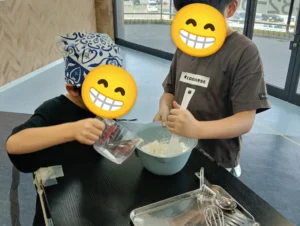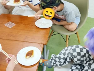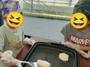 今週は調理のプログラムがあり、ホットクを作りました!「ストップって言ったら止めてね」と協力しながら水を入れたり粉を測ったりしていました⭐️