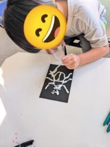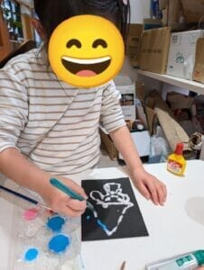 ボンドで線をなぞり、塩をかけて絵の具を垂らすと素敵な絵の出来上がり。みんな真剣に取り組んでいました。