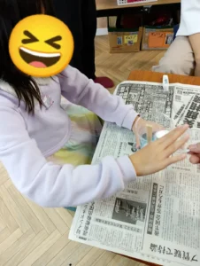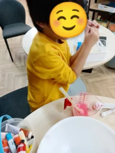 色を付ける時「小指の爪くらいの量だよー」と言うと、自分の爪を見て「右と左どっちをしようかな〜」と悩む生徒もいました☺️