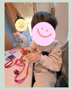 くるくるにしたモールにリボンを通してクリスマスリース作りをしました。