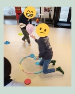 今週の運動プログラムは、風船を落とさないようにしながら、床においてあるカードを裏返すゲーム!