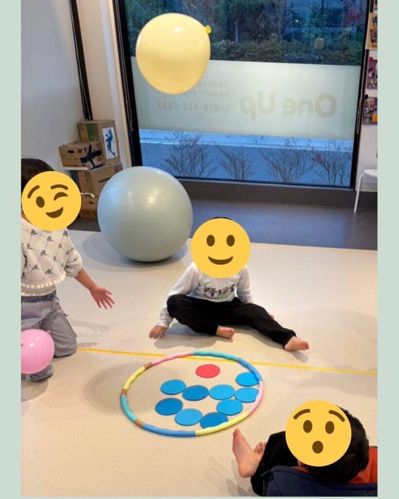 今週の運動プログラムは、風船を落とさないようにしながら、床においてあるカードを裏返すゲーム!