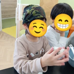 三角のおにぎりを目指してみなさん取り組んでいましたが、きれいな三角にするのがなかなか難しく「やっぱりまんまるにしようかな、おむすびコロリンみたいなやつ!」と形を変えながら楽しく作っていました✨️