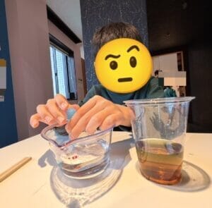 スポイトで塩水を入れるところが難しく、上手く色が分かれなかったりしたけど、「なんで?もう一回やりたい!」と、繰り返しチャレンジしたい気持ちも芽生え、みんな興味津々で取り組んでいました!