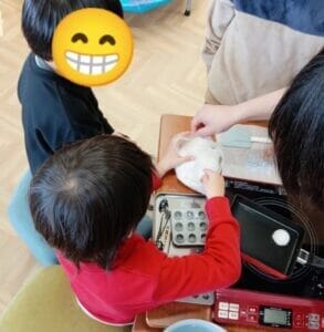 「こんな飴ができるよ」と完成品を先に大公開!「本当だ!」「やってみたい!」と好奇心・探究心に溢れていました☺