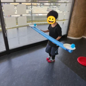 プールスティックの両端に紙皿を乗せ、さらにその上にカラーボールを乗せて落とさずに運ぶ内容です。